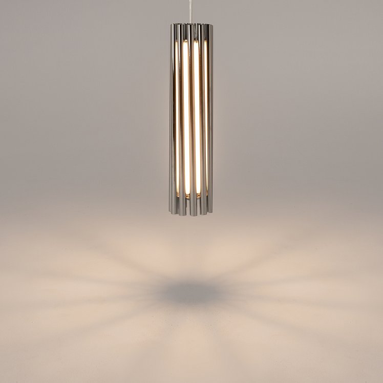 Мягкий световой поток пробивается через отверстия между трубами, создавая уникальное сочетание света и бликов на зеркальной поверхности.