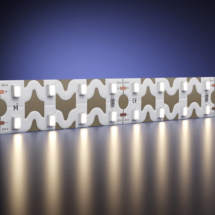 Лента с изгибом в плоскости мощностью 9.6 Вт/м (48 Вт на 5 м). Цветовая температура - 3000К и 4000К в зависимости от выбранной модели. Плотность светодиодов — 120 шт/м (600 шт на 5 м). Размер — 6х5000 мм, кратность реза — 50 мм. Индекс цветопередачи >90Ra. Угол рассеивания 120°. Рабочее напряжение 24 В. Для создания световых линий с возможностью включения белого цвета в декоративной подсветке потолочных ниш. Идеальное решение для подсветки сложных рекламных конструкций нестандартной формы.