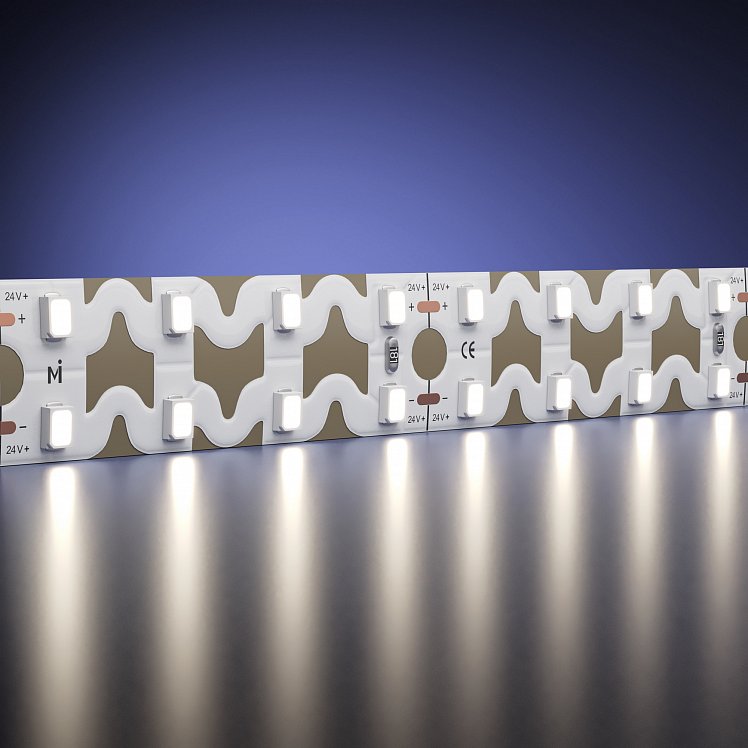 Лента с изгибом в плоскости мощностью 9.6 Вт/м (48 Вт на 5 м). Цветовая температура - 3000К и 4000К в зависимости от выбранной модели. Плотность светодиодов — 120 шт/м (600 шт на 5 м). Размер — 6х5000 мм, кратность реза — 50 мм. Индекс цветопередачи >90Ra. Угол рассеивания 120°. Рабочее напряжение 24 В. Для создания световых линий с возможностью включения белого цвета в декоративной подсветке потолочных ниш. Идеальное решение для подсветки сложных рекламных конструкций нестандартной формы.