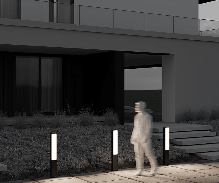 Светильники серии выделяются своими элегантными вытянутыми формами. Высота 1000 мм и 2500 мм создает доминирующее присутствие, идеально подходящее для основного освещения экстерьера.