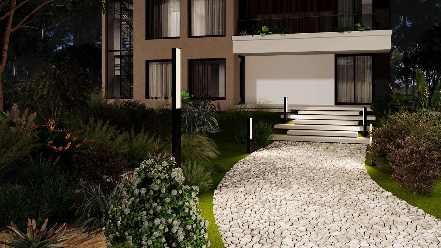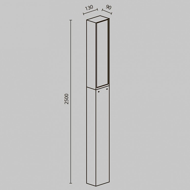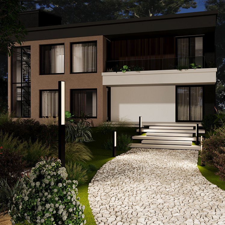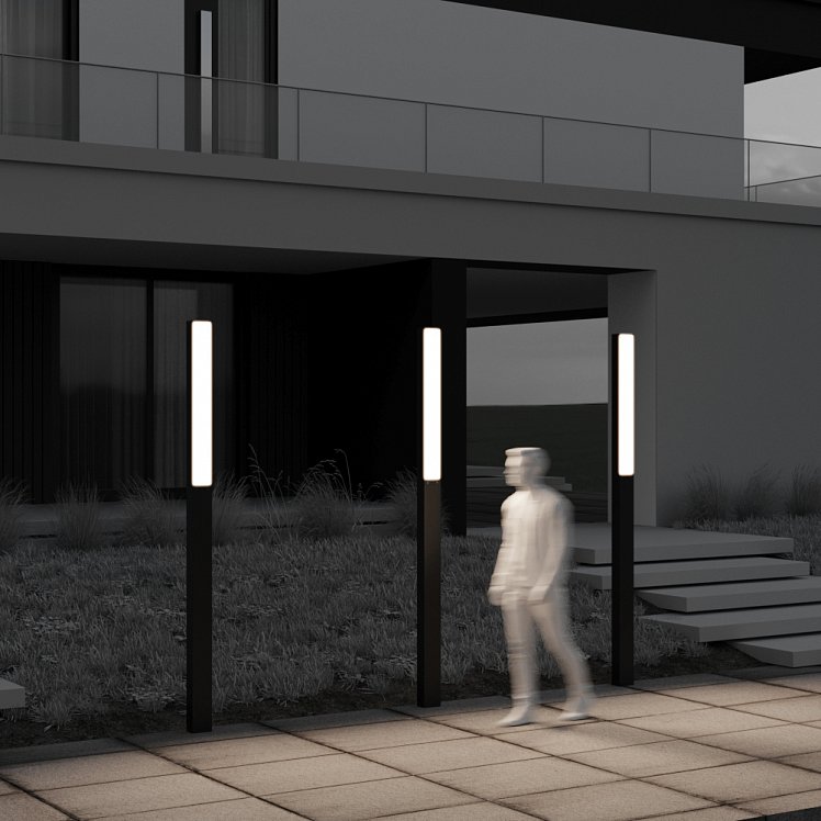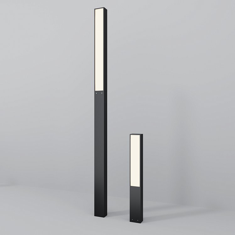 Светильники серии выделяются своими элегантными вытянутыми формами. Высота 1000 мм и 2500 мм создает доминирующее присутствие, идеально подходящее для основного освещения экстерьера.