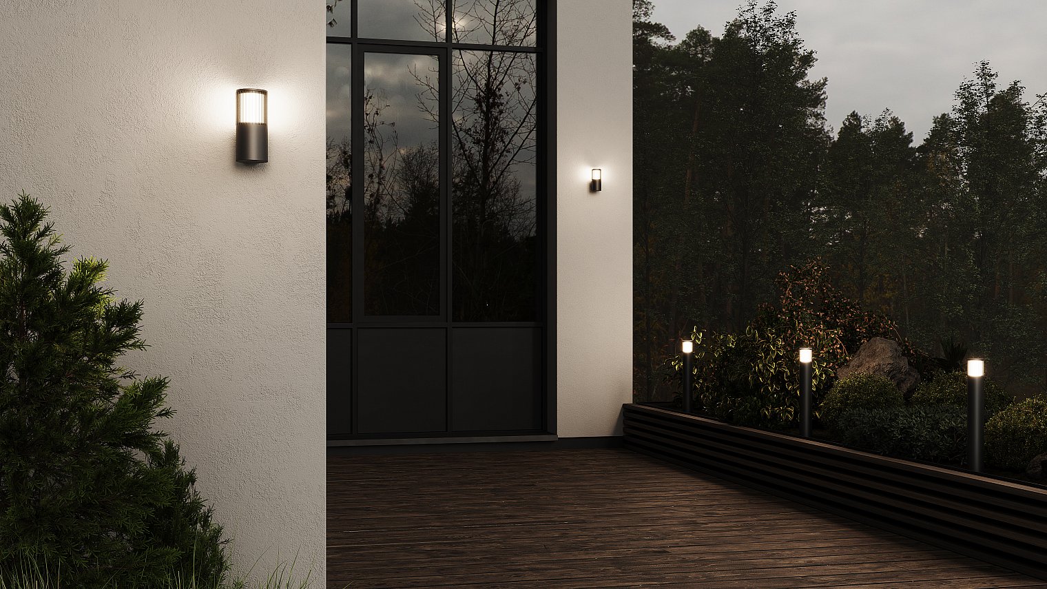 Ландшафтная модель с повышенной степенью защиты IP65 и настенные светильники с IP54 устойчивы к пыли и влаге, что делает их идеальными для использования как на улице, так и в помещении.