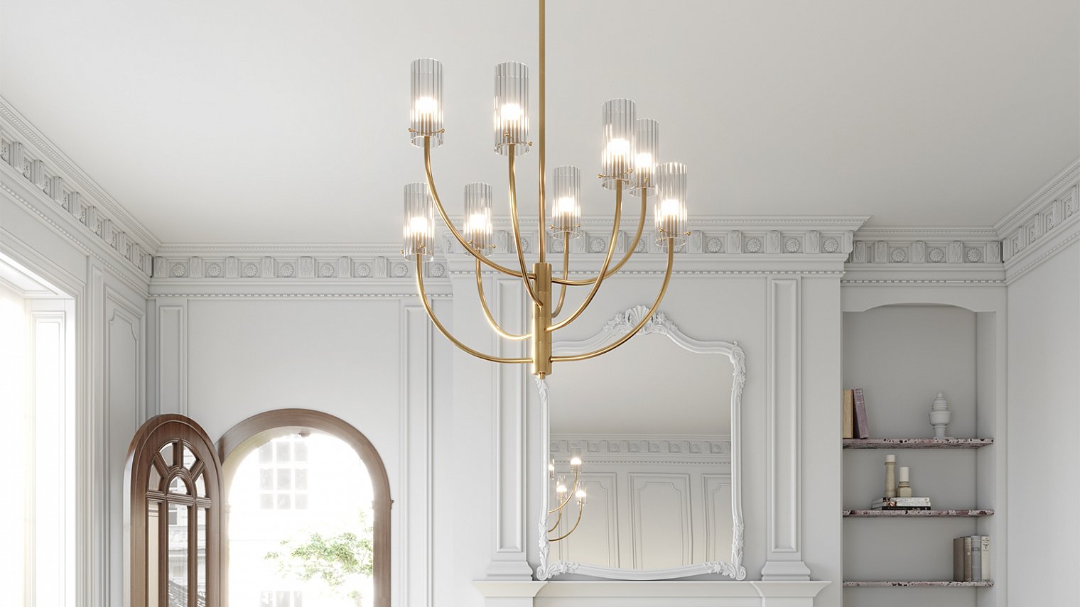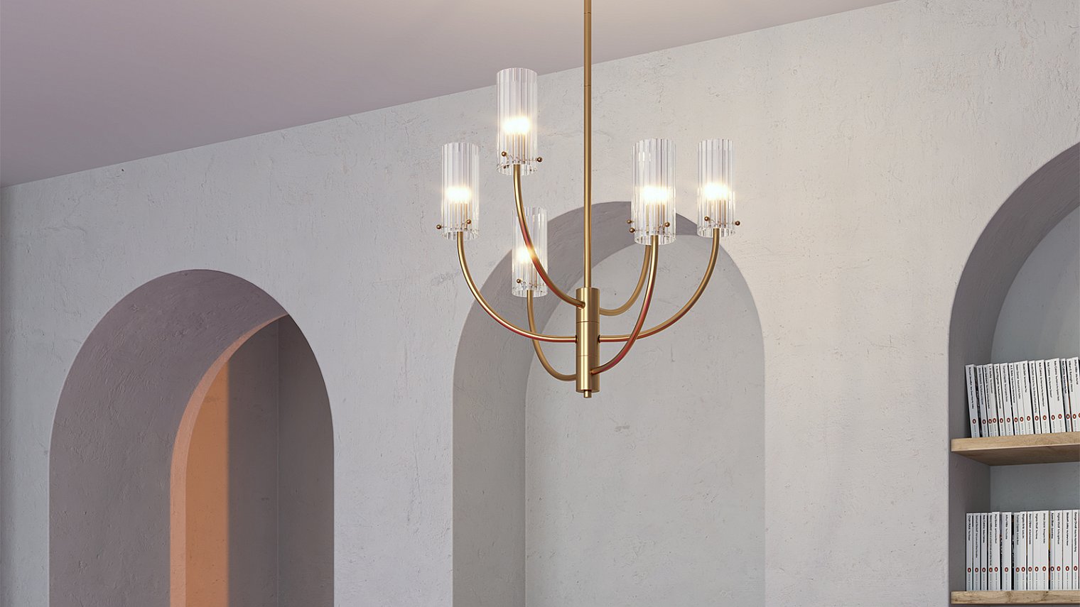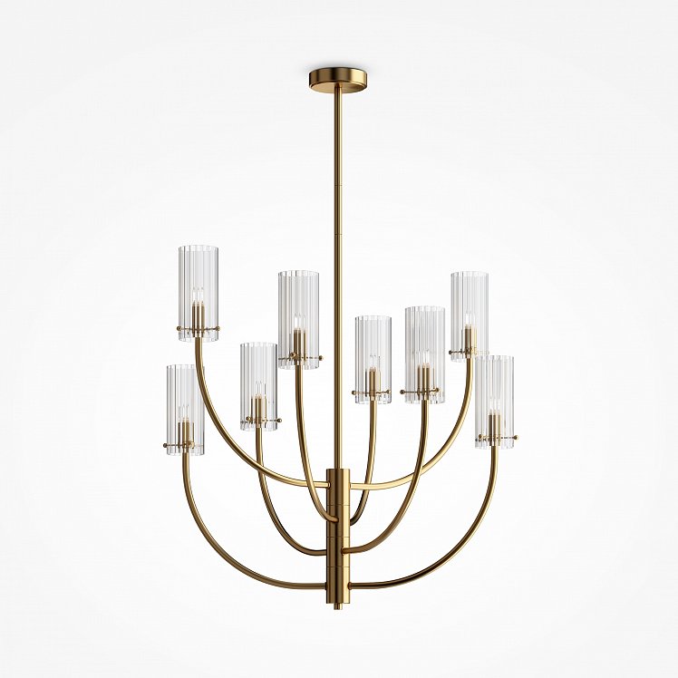 Дизайн серии Arco выполнен в стиле эпохи mid-century modern. Об этом напоминает сложная геометрия металлической арматуры, гальванизированной в благородный оттенок латуни. Стилистика середины XX-го столетия угадывается и в рифленой фактуре плафонов, выполненных из выдувного стекла. В серию входят 3 потолочных люстры на 3, 6 и 8 ламп, их высота регулируется штангой. Бра накладного монтажа представлены в двух вариантах с симметричной композицией плафонов. Все светильники оснащены цоколем для ламп G9 Люстры и бра удобно комбинировать в группы, составляя разнообразные световые сценарии в единой стилистике.