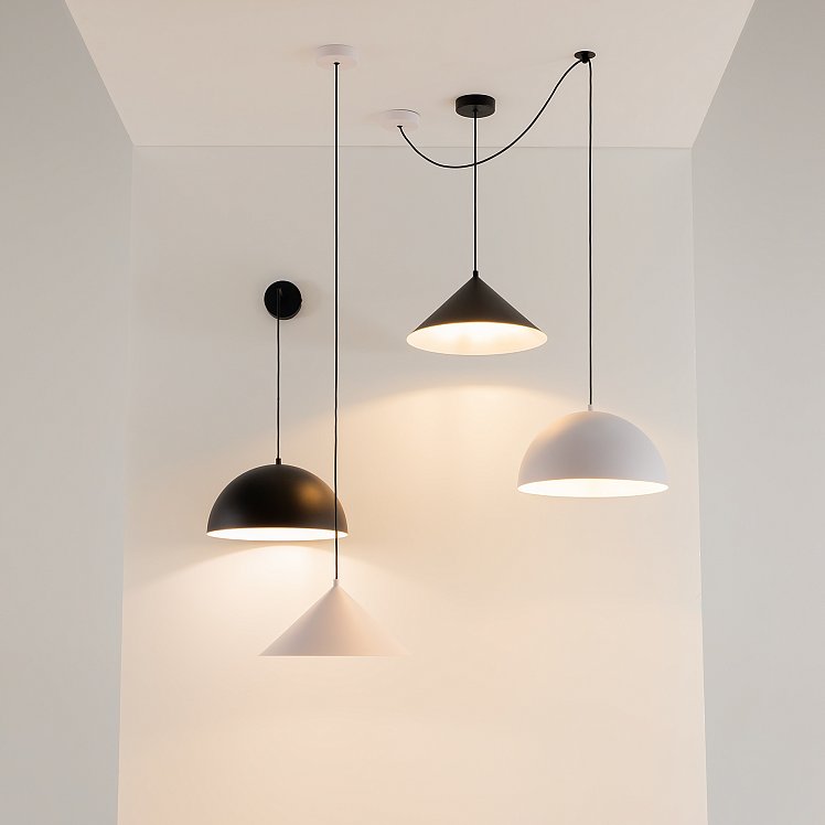 Универсальная форма абажуров и монохромная палитра позволяют собирать композиции из нескольких светильников