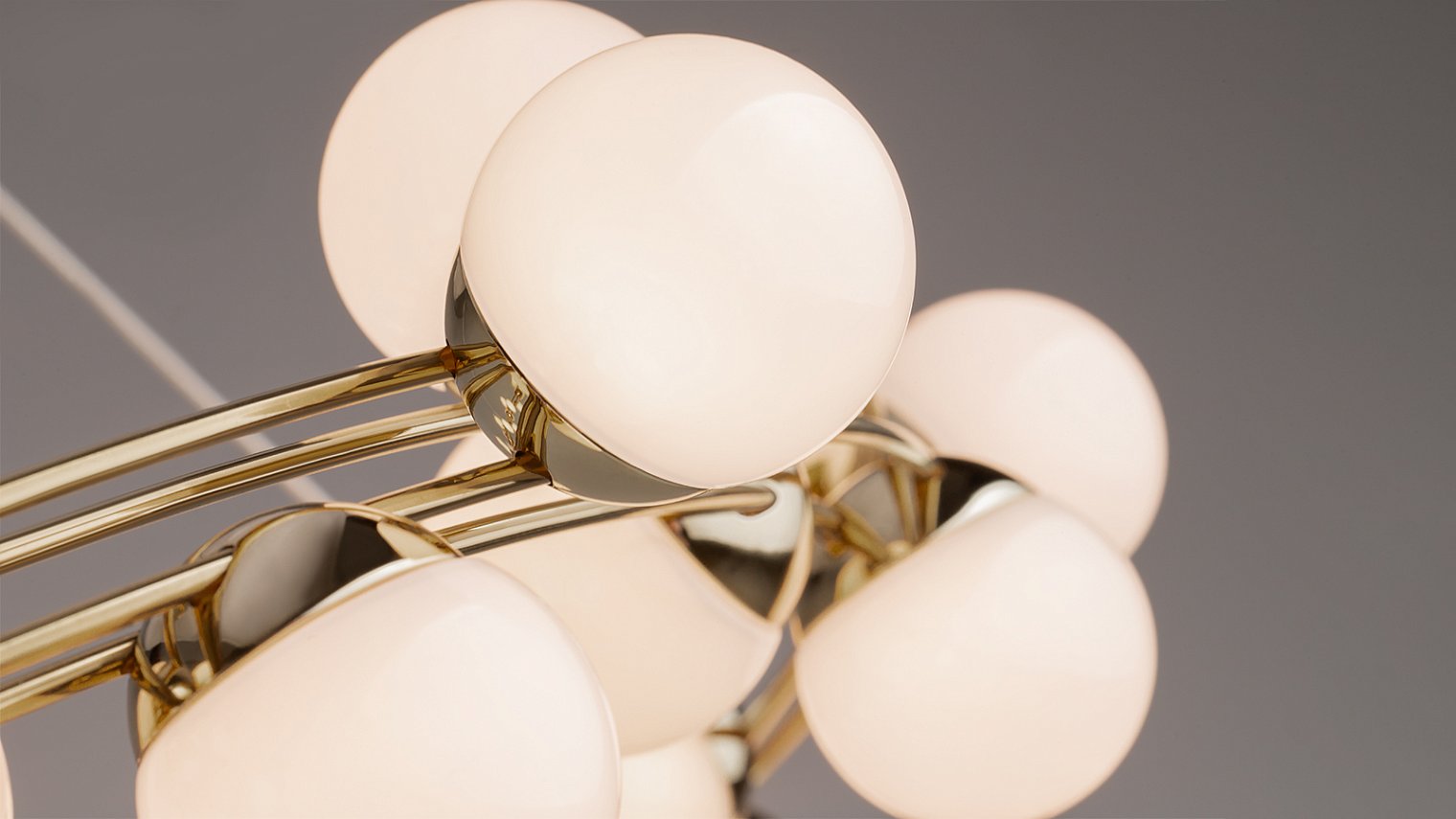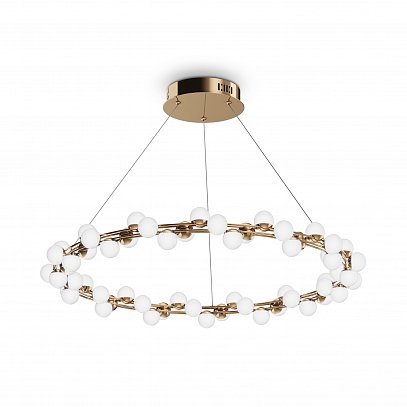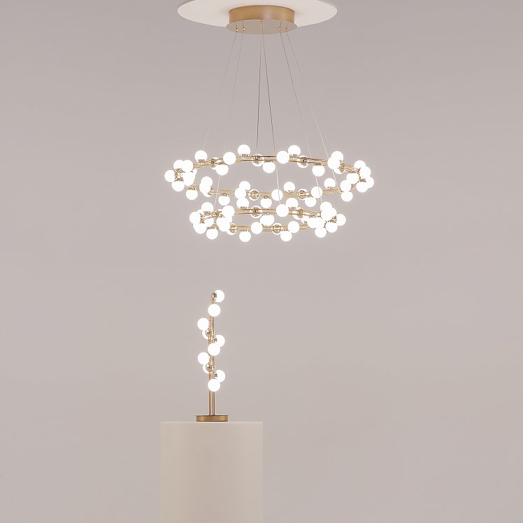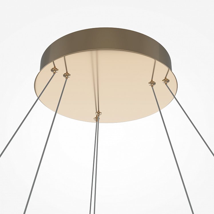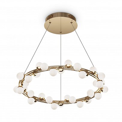 Одна из характерных черт подобных светильников — невесомость конструкции. За счет тонких, практически невидимых тросов, которые регулируются по высоте, создается ощущение, что люстра парит в воздухе. Металлическая золотая арматура и матово-белые миниатюрные плафоны с легкостью дополнят любую палитру, а представленные в коллекции подвесная люстра и бра станут готовым ансамблем для освещения гостиной, спальни, прихожей. В серии представлены потолочные светильники разных диаметров, подвесные на 1 и 2 яруса, настольный и настенный светильники. LED источник света, цветовая температура - 3000К.