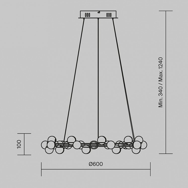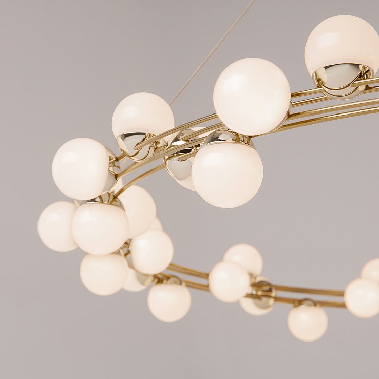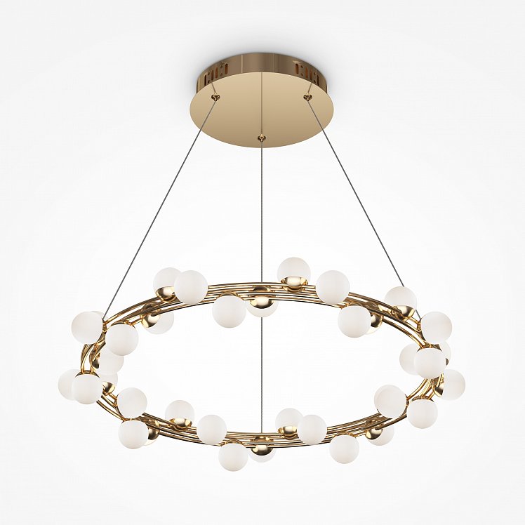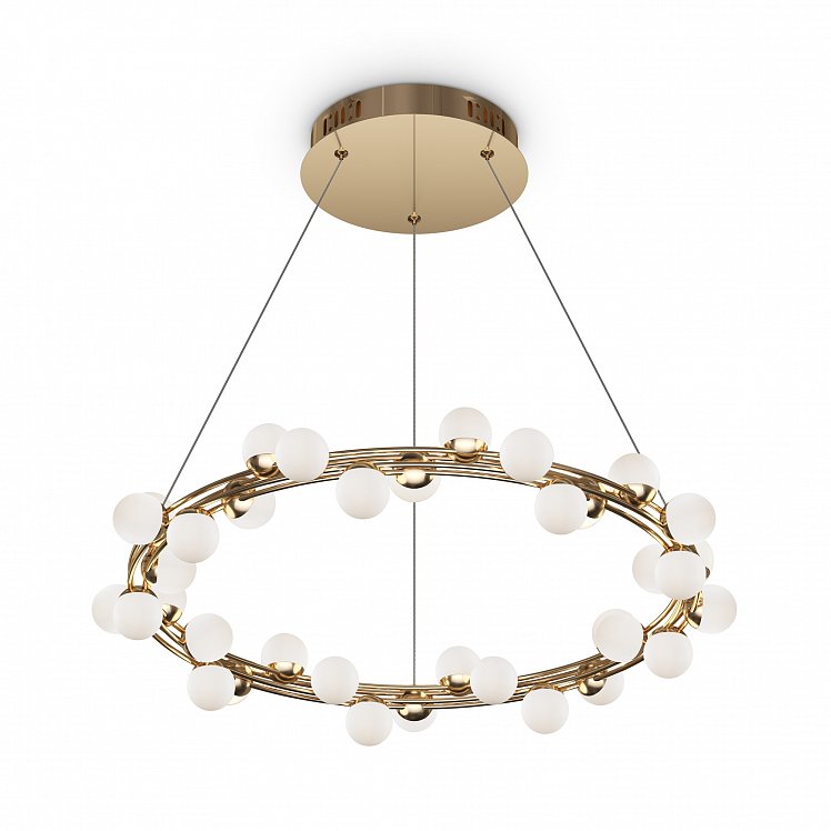 Одна из характерных черт подобных светильников — невесомость конструкции. За счет тонких, практически невидимых тросов, которые регулируются по высоте, создается ощущение, что люстра парит в воздухе. Металлическая золотая арматура и матово-белые миниатюрные плафоны с легкостью дополнят любую палитру, а представленные в коллекции подвесная люстра и бра станут готовым ансамблем для освещения гостиной, спальни, прихожей. В серии представлены потолочные светильники разных диаметров, подвесные на 1 и 2 яруса, настольный и настенный светильники. LED источник света, цветовая температура - 3000К.
