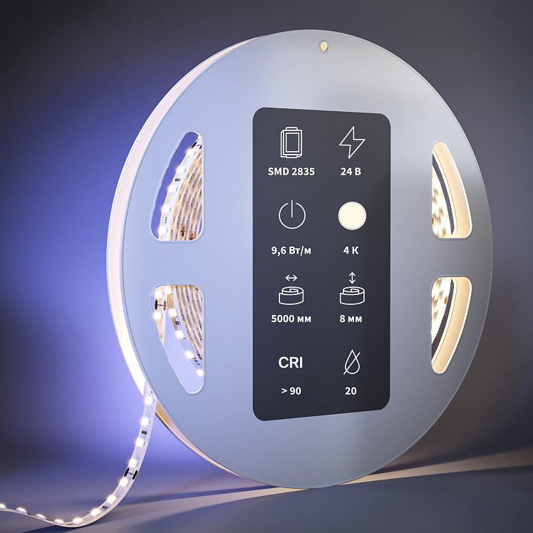 Энергоэффективная светодиодная лента (больше 140-165 Лм/Вт) мощностью 6 Вт/м, 9,6 Вт/м и 12 Вт/м на выбор. Цветовая температура - 2700К, 3000К и 4000К. Плотность светодиодов - 80 шт/м, 128 шт/м и 160 шт/м. Размер - 8х5000 мм. Индекс цветопередачи >90Ra. Угол рассеивания 120°. Рабочее напряжение 24 В. Применяется как для основного освещения, так и для декоративной подсветки интерьера.